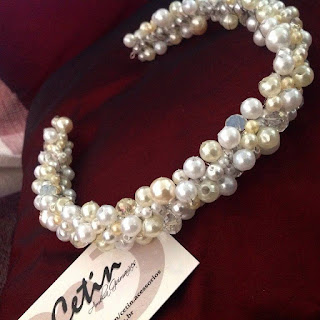 TIARA EM PÉROLAS E CRISTAIS + ARRANJO R$ 450,00